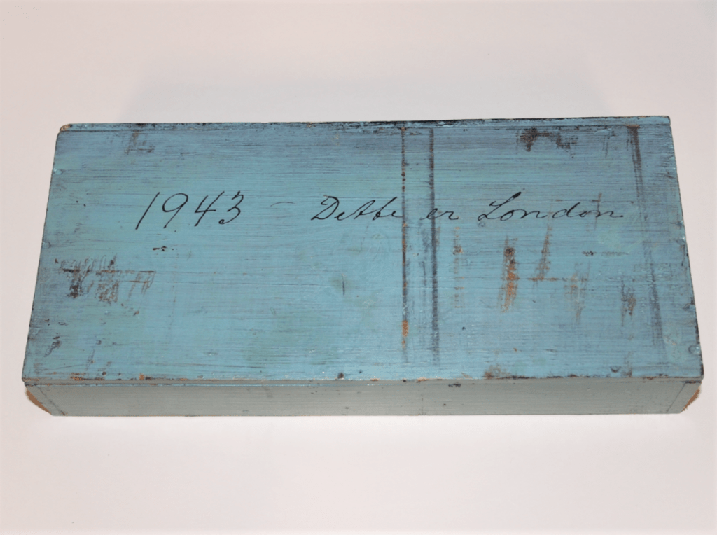 Under den lille skuffen har noen skrevet teksten «1943 – Dette er London». Når denne påskriften har blitt uført er ikke kjent.