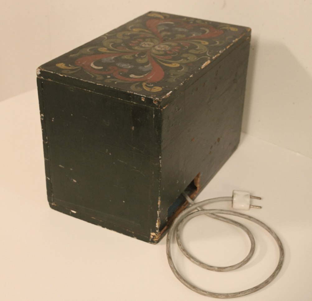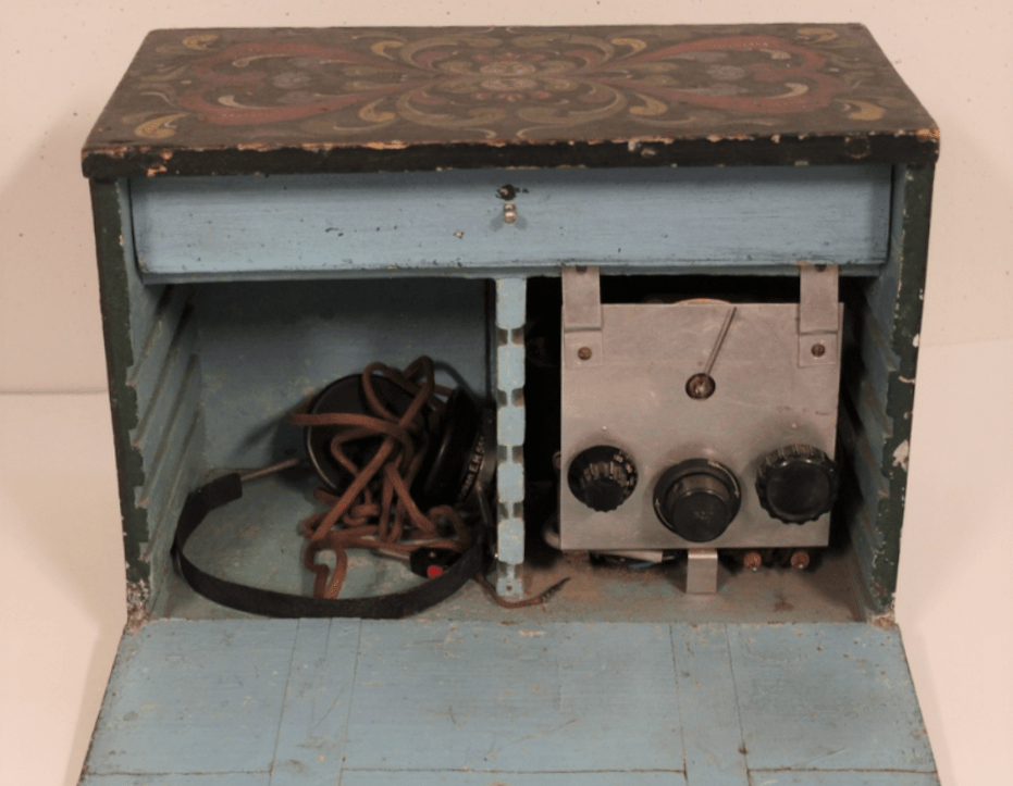 Skulle man velge å ha et radioapparat hjemme, gjaldt det å være kreativ når det kom til oppbevaring. Dette hjemmelagde radioapparatet, kamuflert i et rosemalt skrin er et godt eksempel på dette.