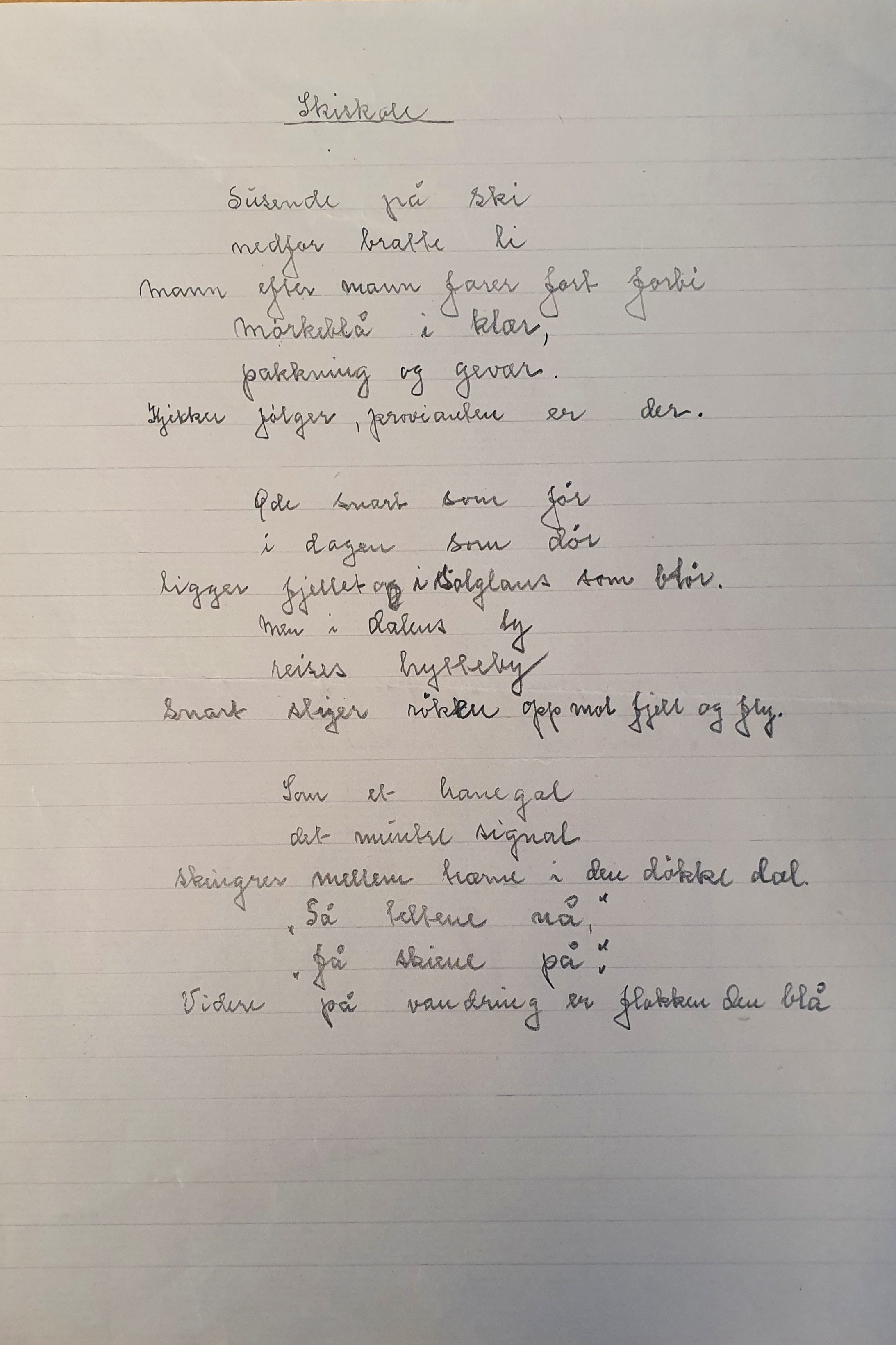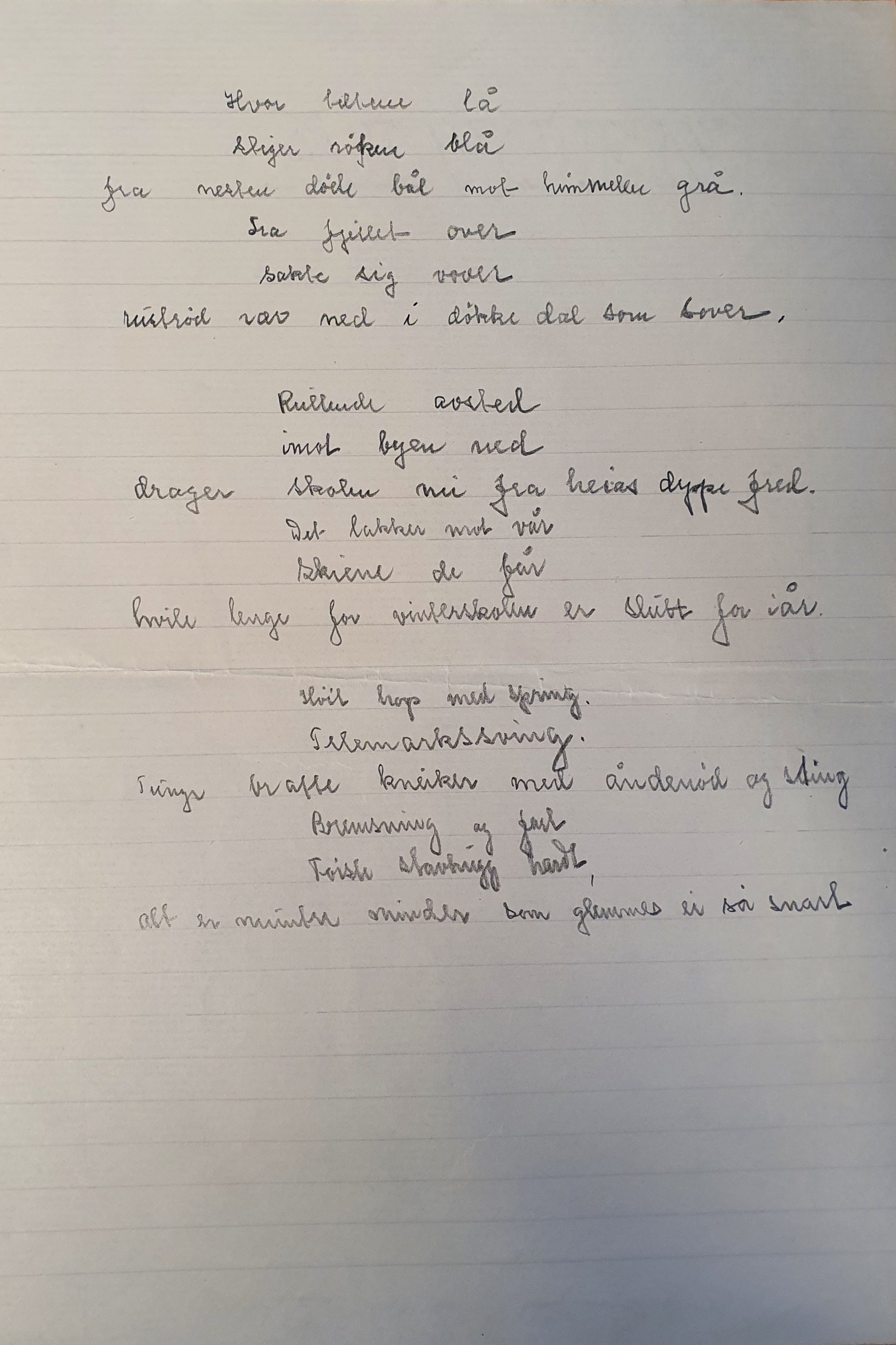 Snart var bålet slukket og dørene forsvarlig stengt men helt til dig var rukket min tanke og al min lengt. Og over veiløse heier siste gang i år alt jeg evner og greier mot sør og dalen det går Så er snart skiskolen omme og hett jeg lengter frem mot dig og at jeg skal komme til dig og vort kjære hjem.