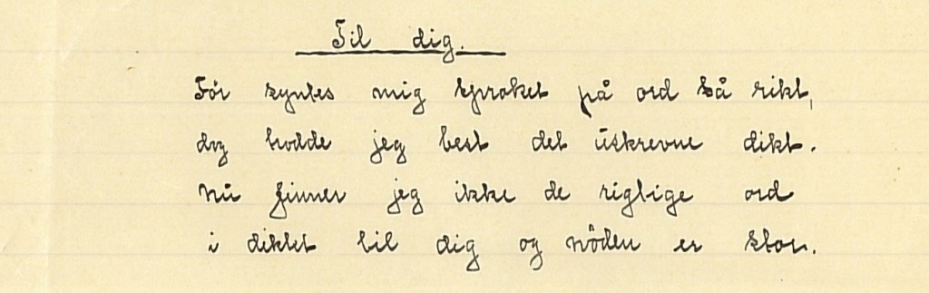 I diktet «Til dig» tematiserer han selve diktningen og letingen etter de riktige ordene. Diktsjangeren blir en målestokk for livet, og han konkluderer til slutt med at «livet mitt er blit lyst og rikt / og med dig er det bedre enn alle dikt».