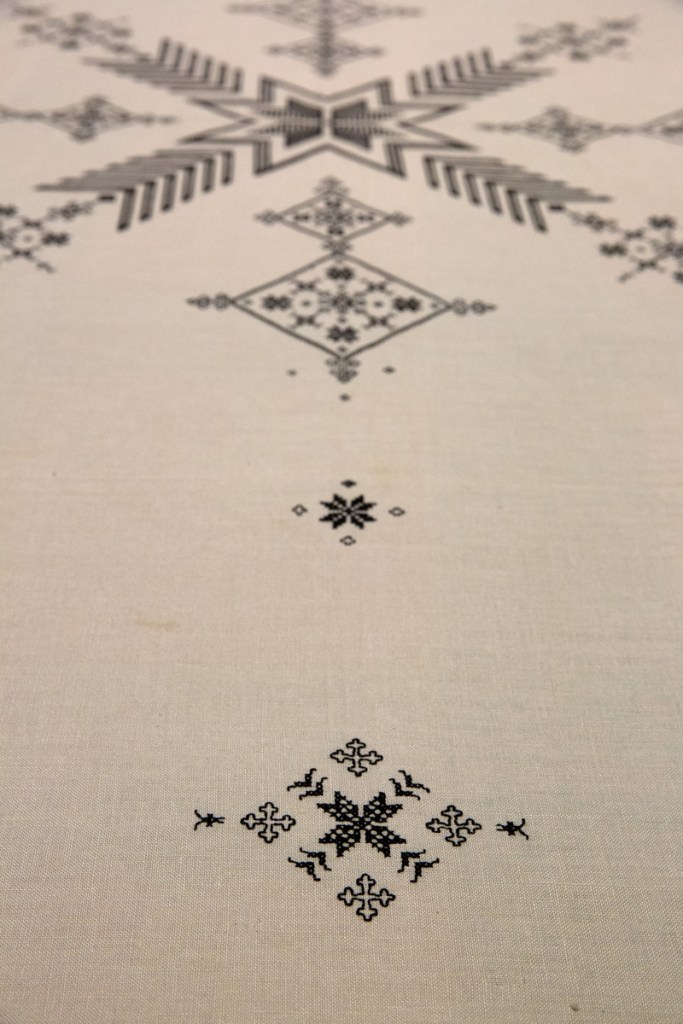 Det er en flott duk, med vakre broderier, og Caroline broderte inn sin holdning til krigen gjennom symbolbruk kanskje bare hun selv visste betydningen av. Men noen ting vet heldigvis også vi. Langs dukens ytterkant broderte hun en bred bord. Denne består blant annet av en rad med kors på hver side inn mot midten, som symboliserer alle liv krigen kostet på begge sider.