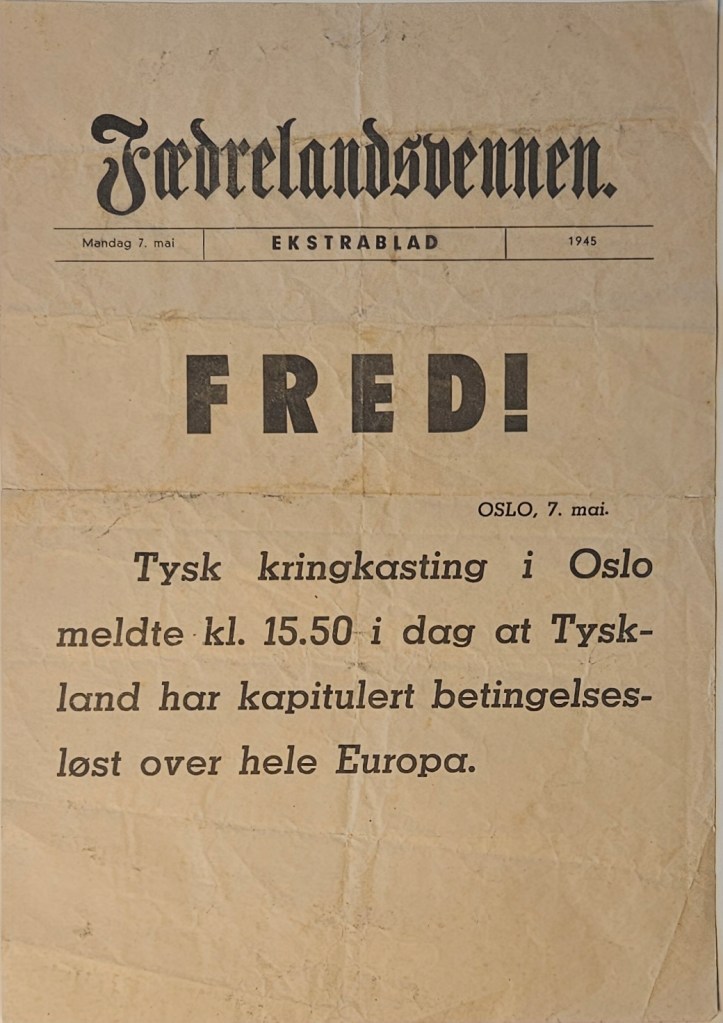 Da det på ettermiddagen 7. mai ble det annonsert over radio at Tyskland hadde kapitulert, og at det fra 8. mai offisielt ville være fred, skyndte avisene seg å trykke løpesedler med nyheten, som mange barn og unge hjalp til med å dele ut til oppmøtte. I vår avissamling har vi Fædrelandsvennens godt kjente løpeseddel, som er avbildet lengre oppe, men dessverre ingen som ble trykket av andre aviser.