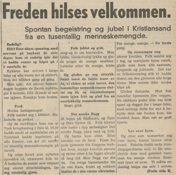 I alle avisene fra 8. mai 1945 kan vi lese en del nasjonale nyheter, som er identiske i alle aviser, men det er også en del egenprodusert stoff om den første tida etter at fredsbudskapet kom. Dermed får vi tidlige rapporter om folkemengdene som samlet seg blant annet på Torvet i Kristiansand. Vi kan dessuten lese at det allerede i noen dager hadde vært ansamlinger av folk som var ivrige etter å høre nyheter om frigjøring.