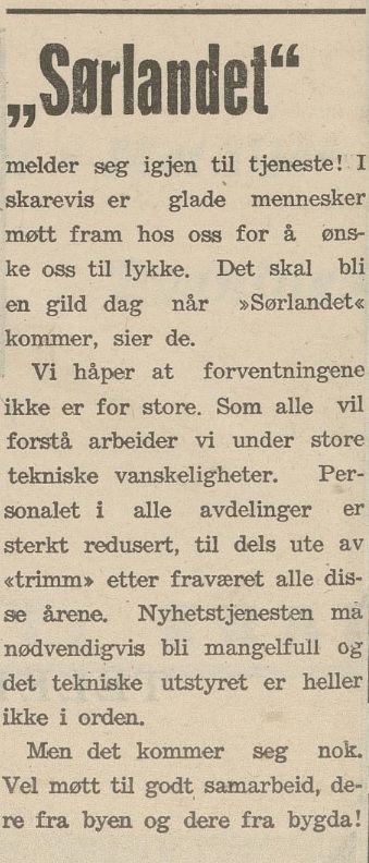De to sistnevnte avisene måtte altså tromme sammen alt de kunne finne for å starte opp igjen etter krigen, og 8. mai ga de ut avis for første gang på noen år. I Sørlandet kommenteres dette på denne måten, i omtalen av 7. mai: «Som ventelig var, var alt kaos, og vi tør si et eneste rot i redaksjonen. Etter 5 års okkupasjon var jo ikke annet å vente.»