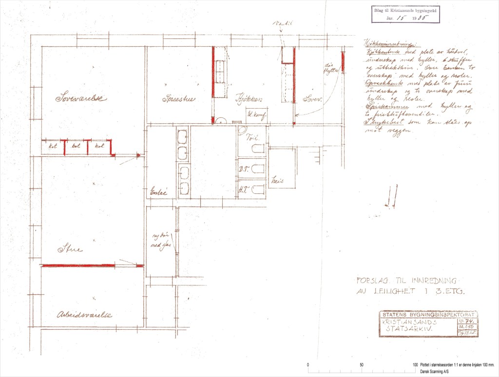 Leiligheten besto, ifølge tegningen, av to soveværelser, kjøkken, spisestue, stue og et arbeidsværelse. Statsarkivaren hadde med andre ord svært kort arbeidsvei. Noe bad er det ikke tegnet inn, så en kan kanskje anta at familien benyttet seg av fasilitetene på statsarkivet. Det var toaletter i samme etasje som lesesal og leilighet, mens det var et bad med badekar i kjelleren. Dette var en tid hvor det var helt vanlig å bo i leiligheter hvor en delte toalett med naboer, men hvordan kan det ha vært å dele slike rom med dem som jobbet eller besøkte statsarkivet?
