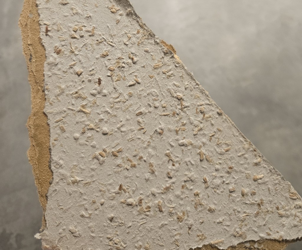 Under det ytterste laget med tykk, sort maling, er det en lys tapet av nesten hvitt papir med innslag av plantefiber eller spon.